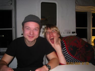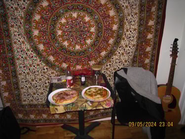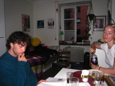 Här är en av de första bilderna som är tagna i min första alldeles egna lägenhet. Att få nycklarna till sin förta lägenhet kändes mäktigt även fast den endast var 17 kvm stor. Men även det kan man komma långt på. På bilden är det dags för mig och Tim att avnjuta varsin fryspizza från Mido livs. Kvällar som denna blev det många av i denna lägenhet.