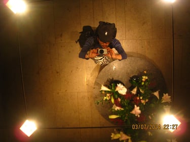 Här tar jag en bild upp i ett spegeltak på Raddison blue i Stockholm. Det var en av de stunderna i livet då du befinner dig på en plats som uppenbarligen är anpassad för klassen över en själv. T.ex när man blir bjuden på fin middag av någons föräldrar på en mycket fin restaurang. Det krävs bara lite pengar för att bli behandlad som en kung i några timmar. I detta fallet bjöd Ediths farsa på två nätter på ett väldigt fint hotell i centrala Stockholm. Det kändes inte som att vi hörde hemma där eftersom att jag och Edith knappast hade haft råd att själva boka rum där. Helt plötsligt har man så många förmåner som man egentligen inte har gjort något för att förtjäna. Man har bara pungat fram lite pengar. Jag minns iallafall att jag sa något till Edith som jag säger varje gång jag befinner mig i sådana situationer. Jag önskar att jag var rik.