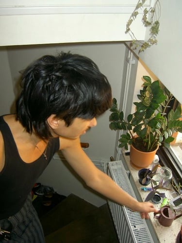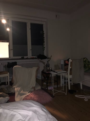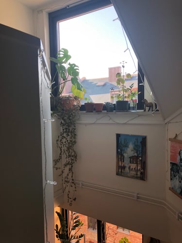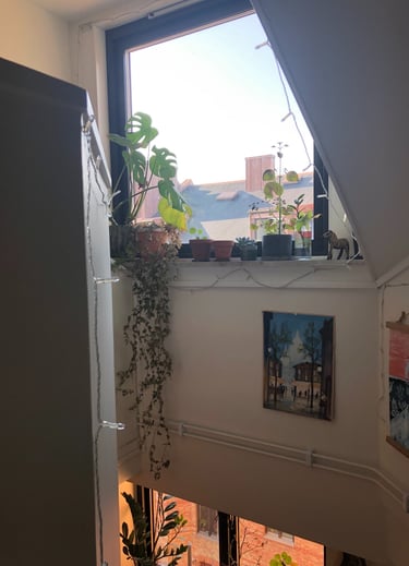 Här är en bild från lägenheten i Malmö. En takvåning med lågt i tak och inte jättefin utsikt. Men bor man med fina vänner och bra fantasi så kan vilket litet skrymsel som helst bli en underbar plats.