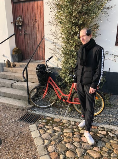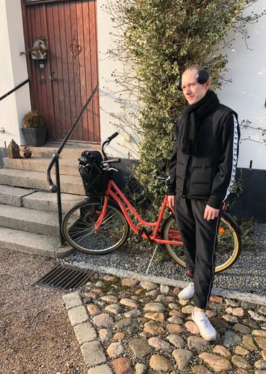 Carl är redo att cykla till gymmet. Han är redan trött på mig och Viggo som har terroriserat hans lugna vardag och jag bestämmer mig för att knäppa en bild. Varför? Jo, för att under de sex åren jag har känt Carl så har jag aldrig sett honom Cykla. Därför trodde jag inte mina ögon när han stod där med sin aldeles egna Cykel, (Som förmodligen tillhörde hans mamma).