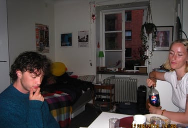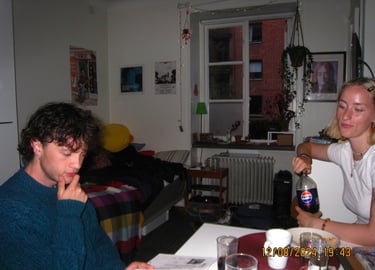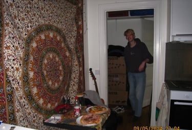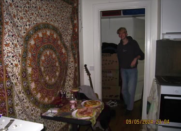Här är en av de första bilderna som är tagna i min första alldeles egna lägenhet. Att få nycklarna till sin förta lägenhet kändes mäktigt även fast den endast var 17 kvm stor. Men även det kan man komma långt på. På bilden är det dags för mig och Tim att avnjuta varsin fryspizza från Mido livs. Kvällar som denna blev det många av i denna lägenhet.