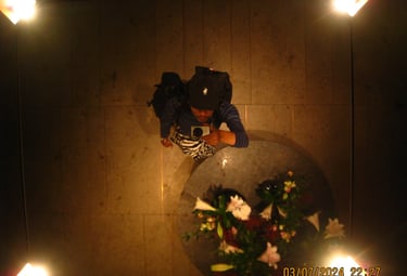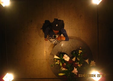 Här tar jag en bild upp i ett spegeltak på Raddison blue i Stockholm. Det var en av de stunderna i livet då du befinner dig på en plats som uppenbarligen är anpassad för klassen över en själv. T.ex när man blir bjuden på fin middag av någons föräldrar på en mycket fin restaurang. Det krävs bara lite pengar för att bli behandlad som en kung i några timmar. I detta fallet bjöd Ediths farsa på två nätter på ett väldigt fint hotell i centrala Stockholm. Det kändes inte som att vi hörde hemma där eftersom att jag och Edith knappast hade haft råd att själva boka rum där. Helt plötsligt har man så många förmåner som man egentligen inte har gjort något för att förtjäna. Man har bara pungat fram lite pengar. Jag minns iallafall att jag sa något till Edith som jag säger varje gång jag befinner mig i sådana situationer. Jag önskar att jag var rik.