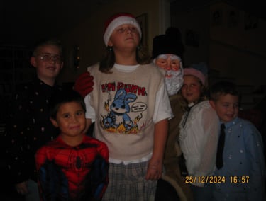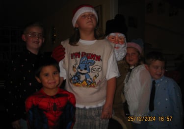 Här är kusinerna samlade på juldagen. Undrar vem som är tomte detta året.